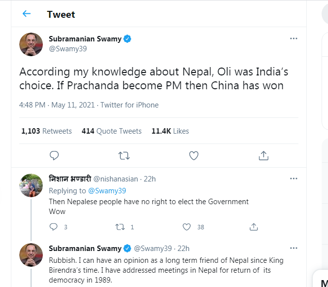 देश गम्भिर मानवीय संकटमा फँसको बेला छिमेकी देशका सत्तारुढ पार्टीका नेता सुब्रहमन्यम स्वामीको अभिव्यक्तिले आम नेपालीको आत्म सम्मानमा चोट पुगेको छ । देशको सार्वभोमसत्तामाथि प्रश्न उठेको छ । राष्ट्रवादका नारा दिनेहरु कसरी विदेशी शक्तिको गोटी बनेका छन भन्ने प्रष्ट पारेको छ । स्वामीले ओली भारतको र दाहाल चीनको रोजाईको व्यक्ति भएको भन्दै ट््वीट गरेका थिए । स्वामीको ट्वीटलाई लिएर नेपाली नागरिक आफनो नेर्ततवलाई घृणाको दृष्टीले हेर्न थालेका छन ।