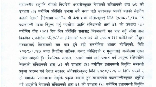 राष्ट्रपति विद्यादेवी भण्डारीले प्रतिनिधिसभा सदस्यलाई संविधानको धारा ७६ को उपधारा ५ अनुसार प्रधानमन्त्रीको लागि आधार प्रस्तुत गर्न समय दिएकी छन् । राष्ट्रपति कार्यालयका सहायक प्रवक्ता केशवप्रसाद घिमिरेले एक विज्ञप्ति जारी गर्दै संविधानको धारा ७६ उपधारा ५ अनुसार प्रधानमन्त्री पदमा दाबी गर्नका लागि प्रतिनिधिसभा सदस्यलाई जेठ ७ गते साँझ ५ बजेसम्मको समय दिएको जानकारी दिएका छन् ।ुनेपालको संविधानको धारा ७६ को उपधारा ९५० बमोजिम प्रधानमन्त्री नियुक्ति गर्ने प्रयोजनका लागि मिति २०७८ जेठ ७ गते साँझ ५स्०० बजे सम्म प्रतिनिधि सभामा विश्वासको मत प्राप्त गर्न सक्ने आधार प्रस्तुत गर्न नेपालको संविधानको धारा ७६ को उपधारा ९२० बमोजिमको प्रतिनिधि सभाका सदस्यलाई आह्वान गर्नुभएको छ,ु विज्ञप्तिमा लेखिएको छ ।