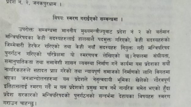 उनले संविधानको धारा ४२ मा सामाजिक न्यायको हक रहेको स्मरण गराउँदै संविधानले गरेको समानुपातिक समावेशी व्यवस्था राज्यका हरेक निकाय र प्रक्रियामा अनिवार्य रुपमा अवलम्वन गर्नुपर्ने पत्रमा लेखेका छन् । जनता समाजवादी पार्टीको उपेन्द्र यादव पक्षका मुख्यमन्त्री लालबाबु राउतले हालै जसपाकै महन्थ ठाकुर पक्षका मन्त्रीलाई सरकारबाट हटाई नेपाली कांग्रेसबाट ३ जनालाई मन्त्री नियुक्त गरेका थिए । हाल ९ सदस्यीय मन्त्रिपरिषदमा हाल आर्थिक मामिला तथा योजना राज्यमन्त्री उषा यादव मात्र महिला छिन् ।
