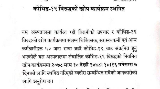 आइतबार अस्पतालले एक विज्ञप्ति जारी गर्दै सोमबार देखि अर्को आइतबारसम्म एक साताका लागि खोप अभियान स्थगित भएको जानकारी दिएको छ ।