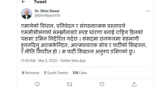 नेकपा एमालेका नेता भीम रावलले संसदमा छलफलमा सहभागी हुन नदिनु आत्मकेन्द्रित, आत्मप्रचारक सोच र पार्टीको सिद्धान्त तथा नीतिविपरीत भएको बताएका छन । उनले ट्वीट गर्दै एमालेको विधानले एमसीसी सम्झौताबारे स्पष्ट धारणा बनाएको र राष्ट्रिय हितको पक्षमा उभिन निर्देशन दिएको समेत बताएका छन ।